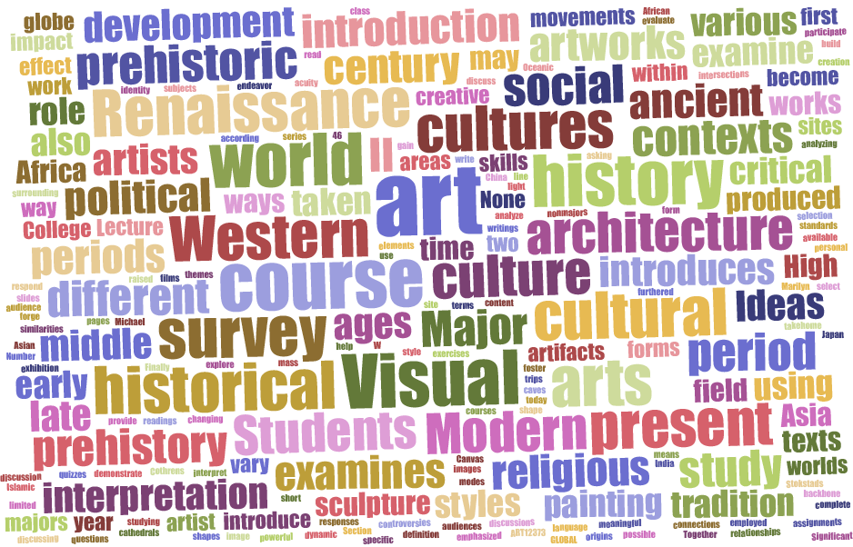 - Multiple courses: Intro to World Art (Thematic 1 semester) with other surveys of specific content areas (Intro to Asian Art, Intro to Modern Art, etc.)